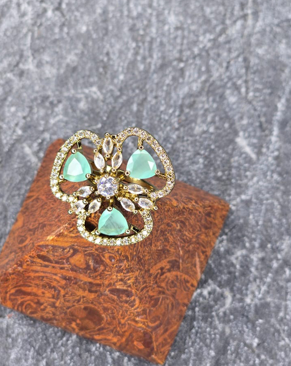 An elegant AD cocktail ring with mint green stones and sparkling American Diamonds, designed in a graceful floral pattern for a luxurious festive look.