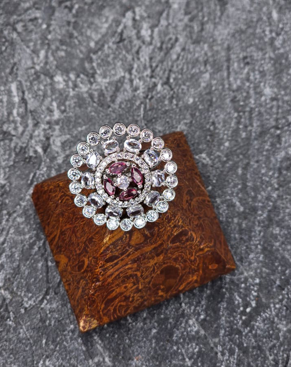 A luxurious AD cocktail ring with a ruby toned center and sparkling American Diamonds, crafted in an elegant circular design for a stunning statement look.