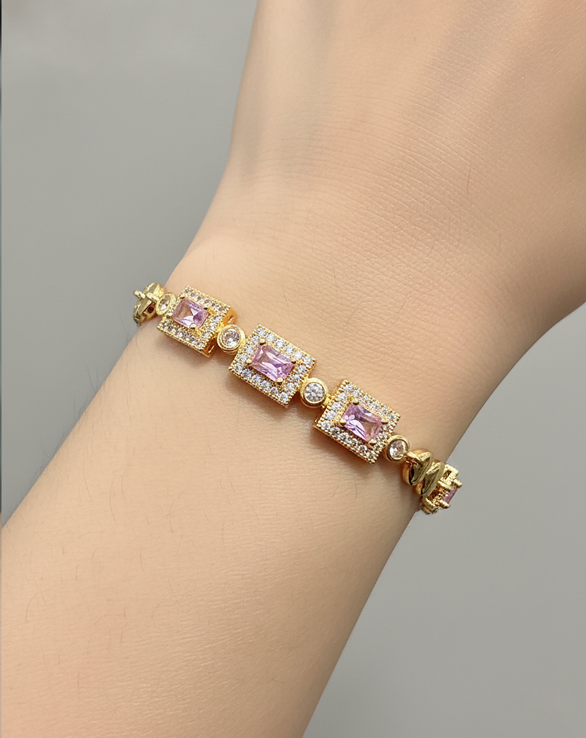 Elegant gold finish bracelet adorned with soft pink stones and sparkling accents for a luxurious look.