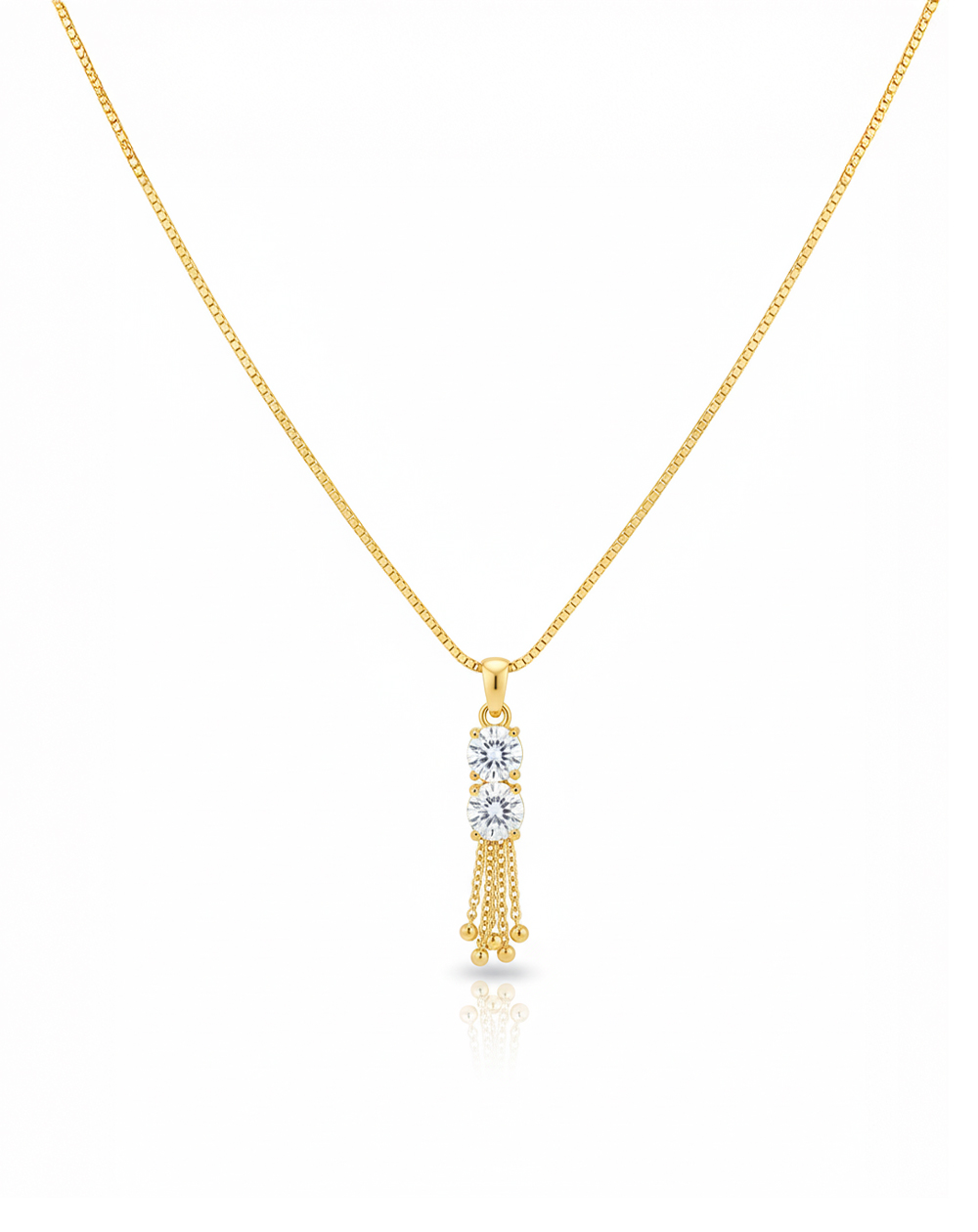 Elegant gold-finish pendant with two sparkling stones and delicate tassel detailing.
