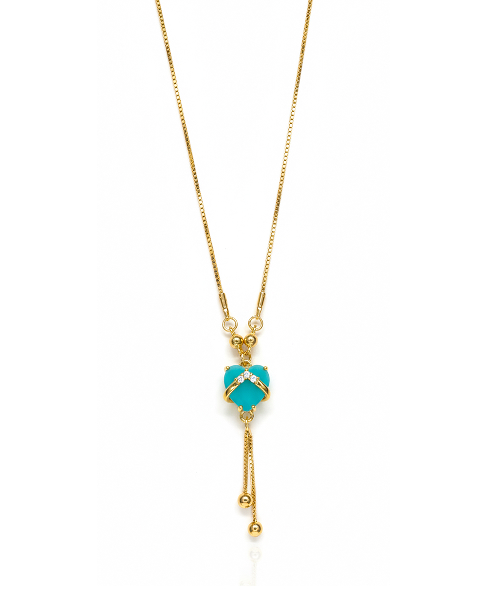 A beautiful gold look pendant with a bright turquoise stone that adds a soft and elegant touch to any look.