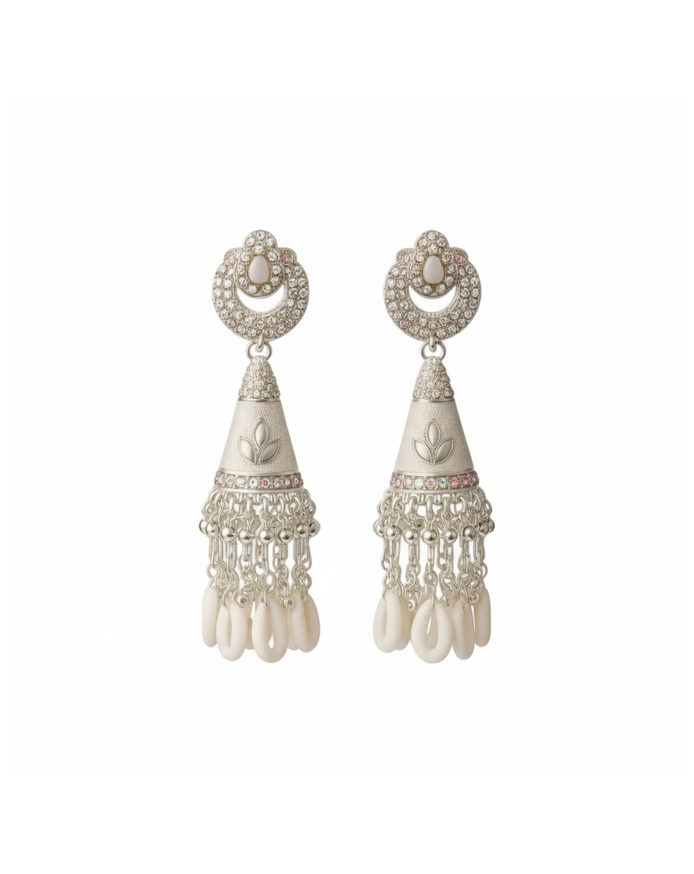 Elegant white drop earrings with a shiny, sparkling finish, perfect for adding a soft, classy touch to any look.